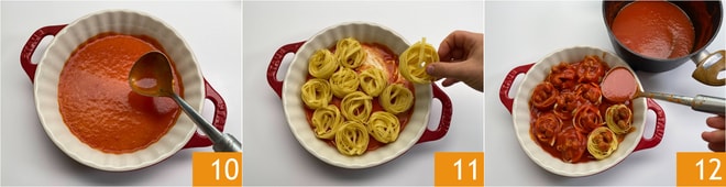 Versez la sauce dans un plat à gratin 10 évasé mesurant 23 cm à la base et 27 cm en surface. Répartissez les nids de tagliatelles 11, couvrez avec plus de sauce et les boulettes 12.