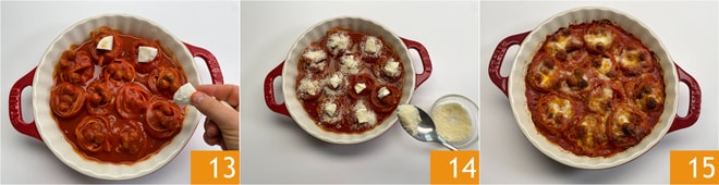 Répartissez sur le dessus les morceaux de mozzarella Fiordilatte 13 et le Parmigiano râpé 14. Faites cuire dans un four ventilé préchauffé à 200°, pendant environ 20 minutes. En fin de cuisson, laissez tiédir quelques minutes et servez avec du basilic à volonté.
