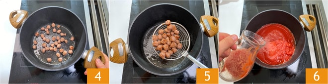 Faites grésiller les morceaux à feu vif 4. Une fois bien saisis, retirez la saucisse et mettez de côté 5, versez la purée de tomates 6 et 500 g d'eau.