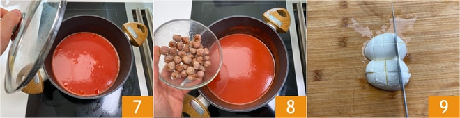Ajoutez un peu de sel, couvrez avec le couvercle 7 et laissez cuire à feu moyen pendant une demi-heure. Une fois le temps écoulé, plongez les boulettes 8 et laissez cuire juste quelques minutes. Pendant ce temps, coupez le Fiordilatte en morceaux 9.