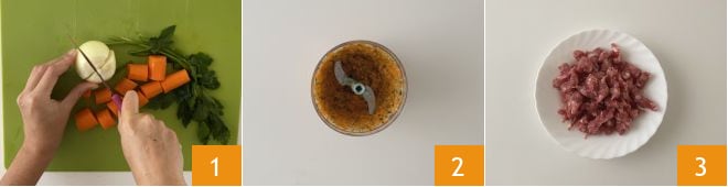Pour préparer les nids de tagliatelles au ragoût de saucisse, commencez par éplucher les carottes et l'oignon. Coupez-les en gros morceaux 1 et mixez-les dans un robot avec la branche de céleri 2. Émiettez la saucisse dans une assiette et réservez-la 3.