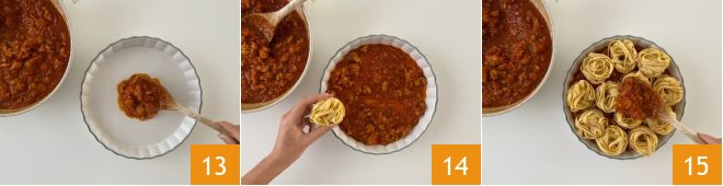 À ce stade, prenez un plat allant au four, suffisamment grand pour ne pas superposer les nids, et recouvrez le fond de ragoût 13. Placez les nids de tagliatelles dessus 14 et recouvrez avec le reste de la sauce 15, en veillant à bien couvrir les pâtes, car elles cuiront grâce à celle-ci.