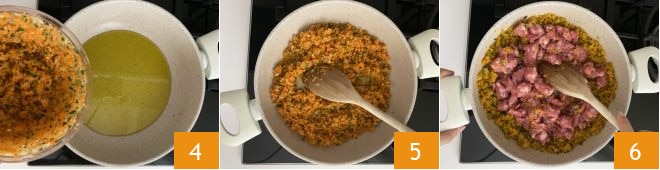 Versez l'huile dans une casserole, ajoutez le soffritto 4 et laissez-le revenir pendant quelques minutes 5. Ajoutez la saucisse et laissez-la dorer 6