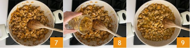 jusqu'à ce qu'elle soit bien dorée 7. Déglacez maintenant avec le vin blanc 8 et dès que l'alcool est complètement évaporé 9