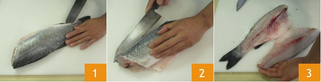 Pour préparer 12 pièces de nigiri de bar, thon et saumon, vous aurez besoin d'environ 144 g de riz pour sushi cuit, découvrez donc d'abord comment préparer le riz pour sushi. Pour obtenir les 40 g de bar nécessaires à la recette, vous pouvez acheter un filet ou prélever la quantité nécessaire du bar de la manière suivante : après avoir enlevé la tête, éviscéré et écaillé le poisson, tournez la partie ventrale du poisson vers vous et découpez pour atteindre la queue, en suivant l'os central 1. Puis procédez avec une coupe le long de tout le dos du poisson, au-dessus de la nageoire 2. Ensuite, tournez la queue du poisson vers votre droite et faites la même coupe au-dessus de la nageoire, de la queue vers la tête. Coupez jusqu'à la base de la queue pour obtenir un filet 3. Retournez le bar avec la chair posée sur la planche à découper et effectuez la même coupe pour obtenir le deuxième filet.