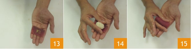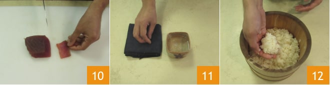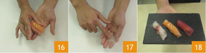 Avec la main gauche, prenez une tranche de thon, assaisonnez avec très peu de wasabi au centre 13, puis placez le riz 14. Pressez légèrement, puis retournez et pressez les côtés du poisson pour modeler le nigiri, avec le pouce et le majeur, de manière à bien unir les deux parties 15. Procédez avec les mêmes opérations pour toutes les pièces de thon,