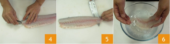 Prenez le filet obtenu, finissez-le et retirez les éventuelles arêtes avec une pince à épiler 4. Enlevez la peau en passant la lame entre la chair et la peau en tenant le filet par la queue 5. Frottez le filet dans un bol avec de l'eau froide, des glaçons et du sel fin dissous 6 : cela permet de retirer autant que possible la partie grasse.