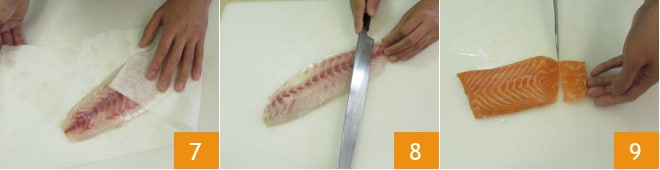 Tamponnez le filet avec un torchon pour bien le sécher 7, puis coupez en oblique et en travers contre les fibres le filet pour obtenir 4 tranches toutes égales, d'environ 12 grammes chacune 8. Procédez de la même manière avec le filet de saumon, toujours avec une coupe contre les fibres pour obtenir 4 tranches d'environ 14 grammes 9.