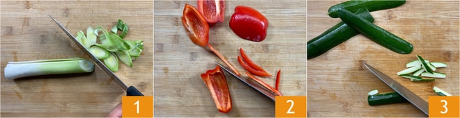 Pour réaliser les nouilles de poulet épicées, commencez par préparer et couper les légumes: coupez le poireau en rondelles 1, puis coupez le poivron 2 et la courgette 3 en lamelles.