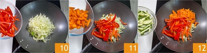 Ajoutez également le chou, le poivron 10, les carottes 11 et les courgettes 12.