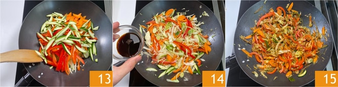 Mélangez bien, assaisonnez avec les deux tiers de la sauce de soja 14 et faites sauter le tout à feu vif pendant environ 8 minutes: de cette façon, les légumes resteront croquants 15.