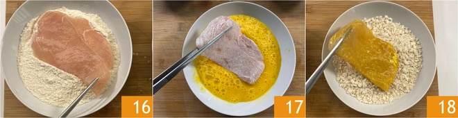 Maintenant, occupez-vous du poulet: recouvrez les tranches de poulet d'abord de farine 16, puis d'œufs battus 17 et enfin de panko 18.