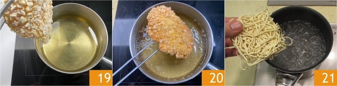Chauffez l'huile de graines à une température de 170°, plongez les tranches panées 19 et faites frire pendant 3-4 minutes, jusqu'à ce qu'elles soient dorées. Égouttez 20 et réservez. Pendant ce temps, portez une casserole d'eau à ébullition et faites blanchir les nouilles pendant une minute 21.