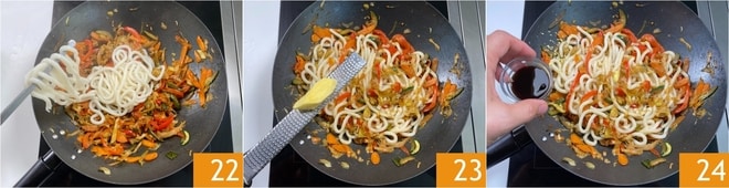 Transférez les nouilles dans le wok 22, râpez le gingembre frais 23 et ajoutez le reste de la sauce de soja 24.