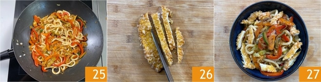 Faites sauter le tout pendant une minute 25. À ce stade, coupez le poulet croustillant en tranches 26 et servez-le avec vos nouilles épicées 27!