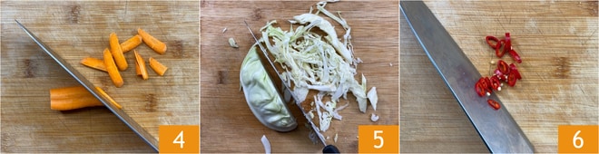Coupez la carotte en deux dans la longueur et tranchez-la finement en diagonale 4, puis coupez le chou en lamelles 5 et le piment en rondelles 6.