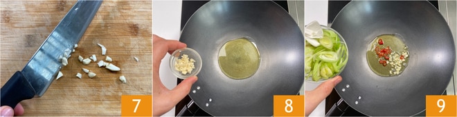 Enfin, hachez l'ail 7. Chauffez l'huile de graines dans un wok, puis ajoutez l'ail 8, le piment et le poireau 9.
