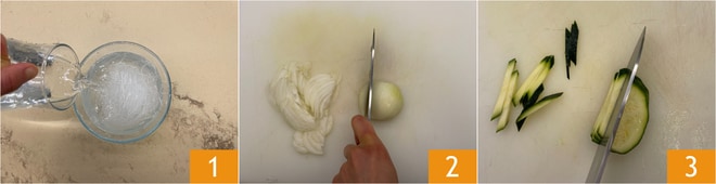 Pour préparer les nouilles de soja sautées, mettez les nouilles à tremper dans de l'eau tiède pendant 30 minutes, encore mieux si vous les laissez toute une nuit dans de l'eau froide 1. Épluchez et tranchez l'oignon 2, coupez les courgettes en bâtonnets 3.