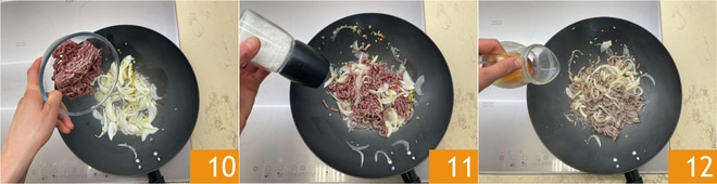 Ajoutez la viande hachée 10, salez 11, poivrez et faites sauter quelques instants, puis faites rissoler et déglacez avec le vin de riz 12.