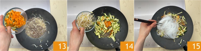 Ajoutez également les légumes 13 et les germes de soja 14. Égouttez ici les nouilles trempées 15, ajoutez aussi l'eau. Mélangez pour rehausser les saveurs.