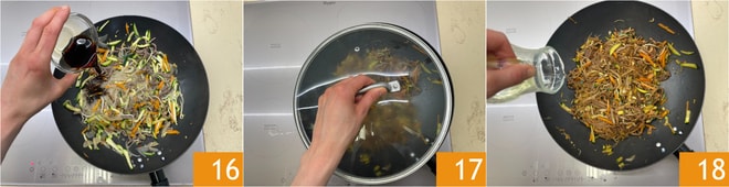 Maintenant, versez la sauce soja foncée 16 puis la sauce claire. Versez l'eau, mélangez à nouveau pour bien amalgamer, couvrez avec le couvercle 17 et faites cuire pendant 5 minutes. Enfin, ajoutez un filet d'huile de graines 18.