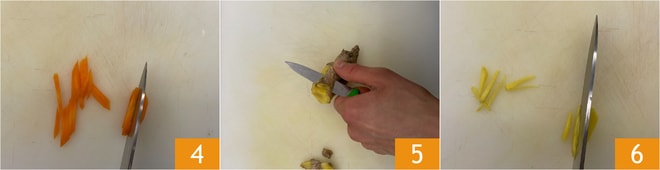 Épluchez et coupez la carotte en bâtonnets également 4. Pelez le gingembre 5 et réduisez-le en bâtonnets 6.