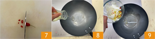 Coupez le piment en fines lamelles 7. Dans le wok, versez un filet d'huile 8, ajoutez-y les oignons, le gingembre et le piment 9. Laissez fondre quelques minutes.