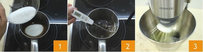 Pour réaliser les nuages de meringue aux noisettes, commencez par préparer le café avec la moka, puis mettez dans une petite casserole à fond épais 60 ml de café et 200 g de sucre semoule 1, chauffez le mélange à feu doux et remuez pour dissoudre le sucre ; dès que le sirop commence à bouillir, plongez-y le thermomètre de cuisine 2, qui vous indiquera la température. Lorsque le sirop aura atteint 116°C, commencez à monter les blancs d'œufs en neige à vitesse moyenne avec un batteur sur socle équipé de fouets 3