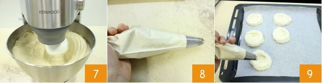 La meringue obtenue doit être très dense, lisse et brillante 7, elle ne peut être cuite que lorsqu'elle est complètement froide. Versez la meringue dans une poche à douille munie d'une douille étoilée 8 et pressez le mélange sur une plaque recouverte de papier sulfurisé en donnant une forme arrondie aux meringues en créant une sorte de panier ou de nid 9. Faites cuire les meringues dans un four préchauffé statique à 80°C et laissez-les sécher pendant au moins 3 heures en laissant la porte du four légèrement entrouverte (pour bloquer la fermeture vous pouvez poser une cuillère en bois sur la porte du four), afin d'éviter une éventuelle condensation qui empêcherait leur bon séchage.