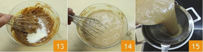 pour finir, ajoutez le lait 13 et mélangez jusqu'à obtenir une crème homogène 14. Versez la crème dans une petite casserole en la filtrant avec une passoire pour recueillir d'éventuels grumeaux 15