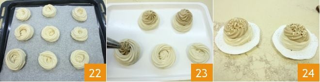 Entre-temps, vérifiez la cuisson des meringues qui seront prêtes lorsqu'elles seront fermes et légèrement colorées en dessous 22. Une fois cuites, sortez-les du four et laissez-les refroidir. Quand tout sera prêt, vous pourrez commencer à composer les douceurs : disposez les meringues refroidies sur un plateau 23 et mettez au centre de chacune un peu de crème. Vos nuages de meringue aux noisettes sont prêts, garnissez-les de brisures de noisette et savourez-les ! 24