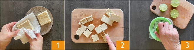 Pour préparer les nuggets de tofu, tamponnez le tofu nature avec du papier absorbant pour bien le sécher de son liquide de conservation 1, puis coupez-le en cubes d'environ 3 cm 2 et transférez-les dans un bol. Coupez 2 citrons verts en deux et pressez-les 3.