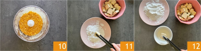 Mixez-les grossièrement 10 et transférez-les dans une assiette. Sortez le tofu du réfrigérateur et passez chaque cube d'abord dans la fécule de pommes de terre 11, puis dans le lait de soja, en prenant soin d'immerger chaque côté 12.
