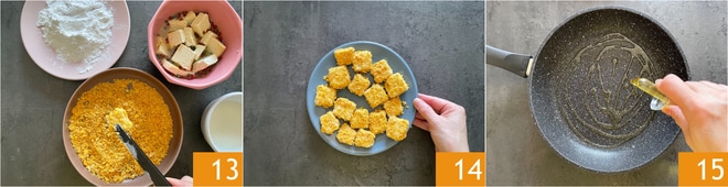 Enfin, recouvrez les cubes avec les cornflakes 13 et placez-les au fur et à mesure sur une assiette 14. Versez un filet d'huile d'olive extra vierge dans une poêle antiadhésive 15 et faites-la chauffer à feu vif.