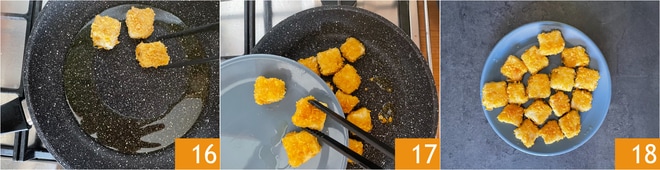 Lorsqu'elle est chaude, déposez les nuggets 16 et faites-les cuire pendant 10 minutes toujours à feu vif, en les retournant souvent pour obtenir une dorure uniforme et éviter de les brûler. Servez les nuggets de tofu dès qu'ils sont prêts 18 !
