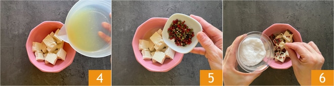 Versez le jus dans le bol avec le tofu 4, ajoutez les grains de poivre 5, une pincée de sel 6 et du poivre moulu.