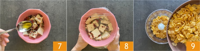 Ajoutez également une cuillère à soupe d'huile 7 et mélangez bien. Couvrez le bol avec du film plastique 8 et mettez au réfrigérateur pendant 30 minutes pour mariner. Pendant ce temps, versez les cornflakes dans un mixeur 9.