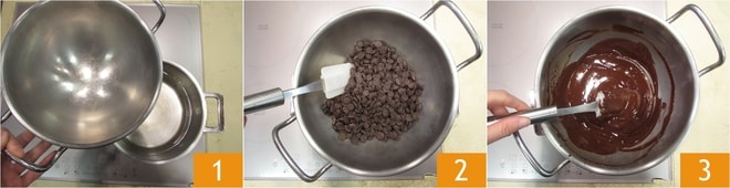 Pour préparer l'œuf de Pâques gourmet, la première étape est de tempérer le chocolat. Munissez-vous d'un thermomètre et faites fondre le chocolat. Vous pouvez choisir de le faire au micro-ondes ou avec la méthode du bain-marie que nous vous montrons. Placez sur le feu une casserole d'eau et mettez dessus un cul-de-poule 1. L'eau ne doit pas bouillir trop fort, sinon elle risque de s'évaporer et de tomber dans le chocolat. Versez ensuite les pépites de chocolat, ou le chocolat grossièrement haché, à l'intérieur 2 et remuez jusqu'à ce qu'il soit fondu 3.