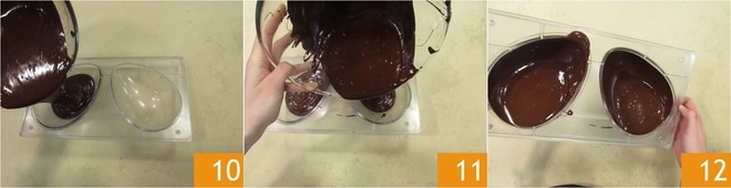 Transférez le chocolat tempéré dans les 2 moules d'œufs de Pâques, que vous aurez soigneusement nettoyés, en remplissant la première 10 et la deuxième cavité 11 jusqu'aux 2/3 du bord du moule. Secouez délicatement le moule pour couvrir chaque partie 12 et attendez environ 45 secondes.