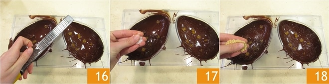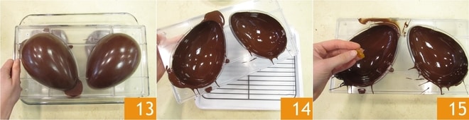 Retournez maintenant le moule pour permettre l'écoulement de l'excès de chocolat 13 : vous pouvez le recueillir dans un plateau et le réutiliser. Ensuite, laissez le moule retourné sur une grille encore quelques secondes pour laisser égoutter l'excès de chocolat 14. Ajoutez maintenant des cubes d'orange confite à l'intérieur de l'œuf 15.
