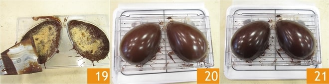 Retouchez les bords avec une petite spatule 19. Retournez le moule, en le plaçant toujours sur la grille 20, et mettez-le au réfrigérateur pendant 5-10 minutes. Ensuite, laissez-le cristalliser à température ambiante. Lorsque le moule devient complètement opaque, cela signifie que le chocolat est bien cristallisé 21.