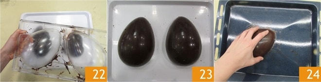 Il suffira de le soulever délicatement 22 pour extraire les deux moitiés 23. Chauffez une plaque au four à 80°. Prenez une des deux moitiés et posez-la brièvement sur la plaque pour décristalliser une partie de la demi-coque 24.