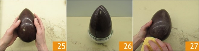 De cette manière, vous pouvez l'unir à la seconde coque 25, de sorte que le chocolat fondu sur les bords, en refroidissant, les maintiendra collés. Placez-le dans un petit bol et attendez qu'il soit bien solidifié 26 avant de continuer. Pour une décoration originale, vous pouvez prendre une éponge et gratter la surface de l'œuf pour le rayer 27.