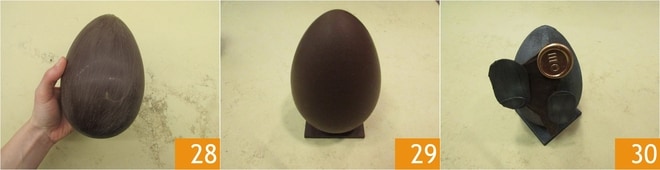 Effectuez cette opération de manière décidée mais délicate 28. Maintenant, décristallisez sur la plaque, comme fait précédemment, la base de l'œuf et placez-le sur un socle en chocolat, de cette façon il restera debout 29. L'œuf de Pâques gourmet est prêt, si vous le souhaitez, vous pouvez le décorer avec des colorants alimentaires et des inserts en chocolat 30.