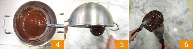 Avec un thermomètre, vérifiez qu'il ait atteint une température entre 50 et 55° 4. À ce stade, séchez soigneusement le fond du cul-de-poule et transférez le chocolat sur un plan en marbre propre et parfaitement sec 5. A l'aide de 2 spatules, étalez et rassemblez le chocolat sur le marbre 6, en le répandant et en le ramenant vers le centre pour refroidir le beurre de cacao.