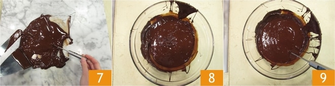 Vous remarquerez que petit à petit, le chocolat deviendra brillant et plus dense. De temps en temps, mesurez la température 7 et dès qu'elle atteint 29°, transférez-le dans un bol à l'aide des deux spatules 8. Mélangez le chocolat et réchauffez-le à nouveau au micro-ondes ou au bain-marie, jusqu'à atteindre une température de 31° 9. Le chocolat est maintenant tempéré.