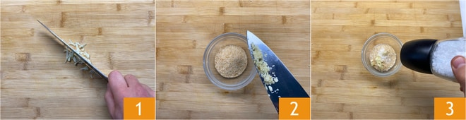 Pour préparer les œufs à la carrettière, commencez par hacher finement l'ail 1 et ajoutez-le à la chapelure dans un bol. Ajoutez le sel 3.