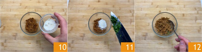 Ajoutez ensuite le pecorino 10, le persil haché 11, mélangez 12 et mettez de côté votre panure.