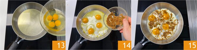 Dans une poêle, chauffez un peu d'huile puis cassez les œufs dans un bol avant de les verser dans la poêle 14. Ajoutez immédiatement la panure, en la répartissant uniformément sur les œufs 14 et laissez cuire 2-3 minutes à feu pas trop élevé 15. Servez à votre convenance avec du pain.