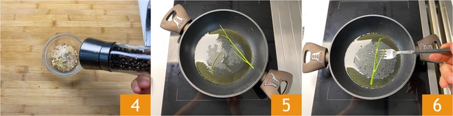 Ajoutez également le poivre et mélangez 4. Prenez le persil, hachez les feuilles et laissez infuser les tiges dans une poêle avec un filet d'huile 5. Retirez ensuite les tiges de persil après 1-2 minutes 6.